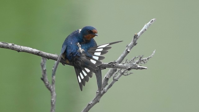 Barn swallow has pointed wings and wingspan of 12.6 to 13.6 inches.